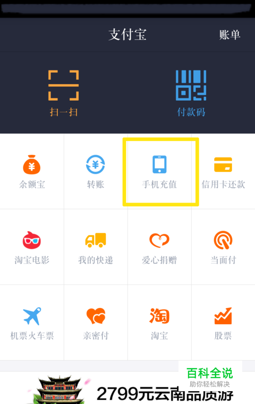 打开手机支付宝软件进入主页面,并且找到“手机充值”。