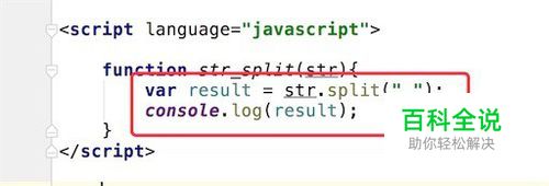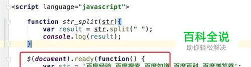 我们先写一个split分割的方法,方法很简单,就是直接调用字符串的split函数,然后把结果显示在浏览器的控制台上。代码如图,split函数的参数就是分隔符,即你字符串里是用什么符号来分隔开的,就传入这个符号。 (如果对JS调试不熟悉的,可以参考下面的链接)