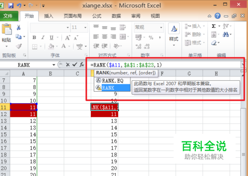 在Rank函数中, 如果出现相同数字,则显示为同一排序。如A列两个11对应的为同一排序。