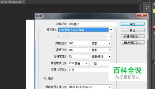 首先打开ps软件,点击开始--新建,新建一个500×500像素的文件,然后用选框工具,拉出一个长方形,