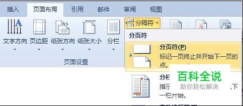 将插入符放置在要分页的位置,然后单击“页面布局”选项卡上“页面布局”组中的“分隔符”按钮,在展开的列表中选择“分页符”。