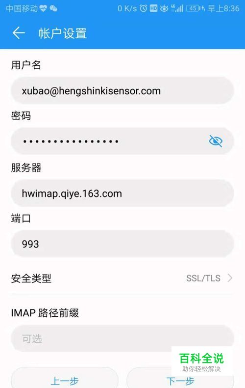 现在就来到了帐户设置页面这里要注意的是把服务器改成“hwimap.qiye.163.com”端口改成“993”安全类型“SSL/TLS” 不同的邮箱设置方法可能会不一样,这里以网易企业邮箱为例