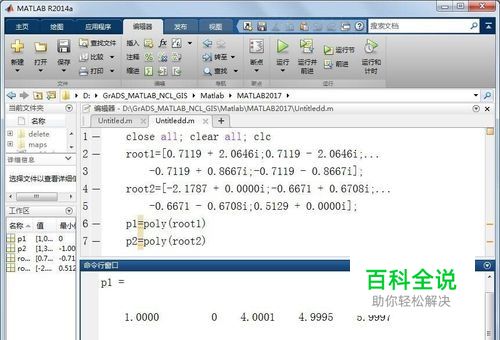 第五,保存和运行上述脚本,在命令行窗口(Command Window)得到根所对应的两个多项式。 p1 = 1.0000 0 4.0001 4.9995 5.9997 p2 = 1.0000 3.0000 2.0001 -0.0000 -1.0001