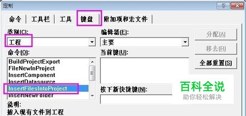 取消原来的插入工程文件快捷键: 在VC++6.0中点击【工具】,【定制】,点击【键盘】标签 ,在“类别下选择 “工程”,在“命令”下选择“ InsertFilesIntoProject”,如果之前给它注册了快捷键,则按照上面所说步骤移除之,默认情况下它是没有快捷键的。