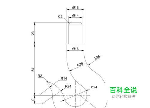 5.横向中心线往上偏移54mm,竖向中心线往两边偏移9mm,画R36与R24的圆角如图