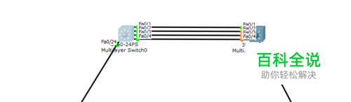 两台三层交换机和两台PC互连。注意端口。两台三层交换机之间连四条线。
