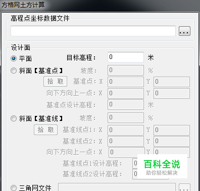 方格网法是工程应用中常用的土方计算方法。如图,设计面选择有四种方式,其中较为常用的有两种,一是 平面 选项,主要用于设计面为平面的情况;二是 三角网文件 选项,主要用于两期都不为平面的情况。本经验主要介绍后者。