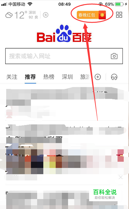 首先打开手机下载的百度app,在首页的页面底端就可以看到有个 春晚红包, 如下图