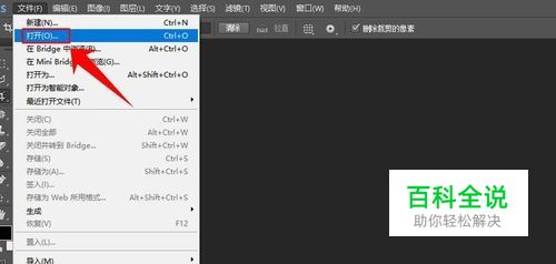 方法1 打开PS软件,在位于软件最上方的菜单栏中选择【文件】,然后再在文件的列表中选择【打开】选项。然后根据素材存储的路径找到素材文件,并点击对话框下方的【打开】选项。