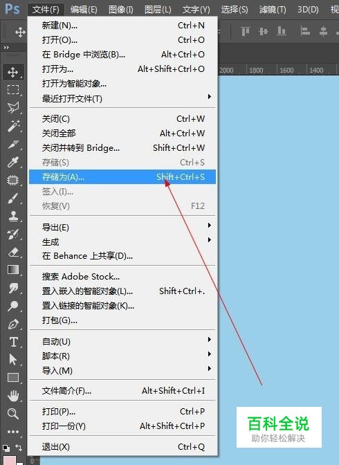 打开ps文件,存储为jpg的方式,在photoshop cc 2017 这个软件中,常用的的三种方法,操作路径如下 1.文件-存储为 快捷键ctrl+shift+s 2.文件-导出-导出为 快捷键 alt+shift+ctrl+w 3.文件-导出-存储为web所用格式 alt+shift+ctrl+s (说明,以上快捷键是默认状态的,如果您之前对软件的快捷键进行过设置,可能会不一样)