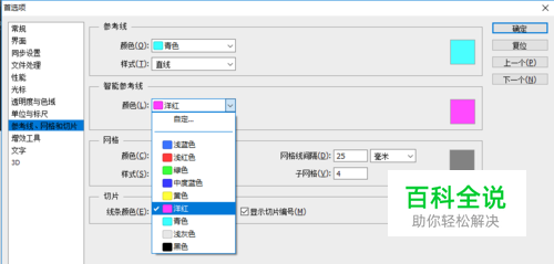 如果我们想修改智能参考线的颜色,可通过同时,Ctrl+K打开首选项对话框 --》参考线、网络和切片--》智能参考线颜色