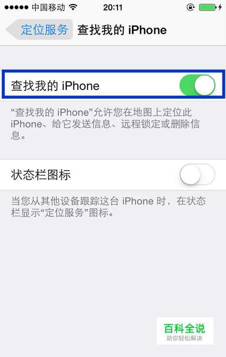 在查找我的iPhone的页面中,把“查找我的iPhone”选项右侧的按钮关闭。
