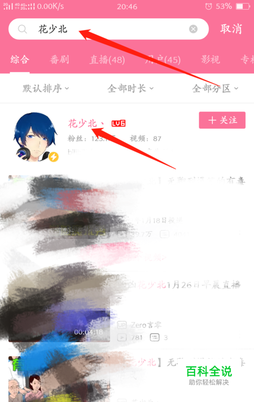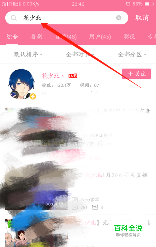 搜索结果出来之后点击up主的名字,进入这位up主的首页。