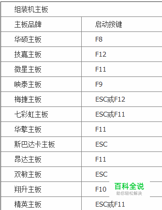 华硕、技嘉、微星、映泰、梅捷、七彩虹、华擎、斯巴达卡、昂达、双敏、翔升、精英、冠盟、富士康、顶星、铭瑄、盈通、捷波、Intel、杰微、致铭、磐英、磐正、冠铭(进入BIOS)如下热键)