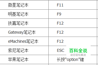 苹果、联想、宏基、华硕、惠普、联想Thinkpad、戴尔、神舟、东芝、三星、IBM、富士通、海尔、方正、清华同、微星、明基、技嘉、、Gateway、、eMachines、、索尼(进入BIOS)如下热键) (注意:苹果笔记本,开机/重启时按住“option”键[即Alt键]不放,进入选择启动方式。)