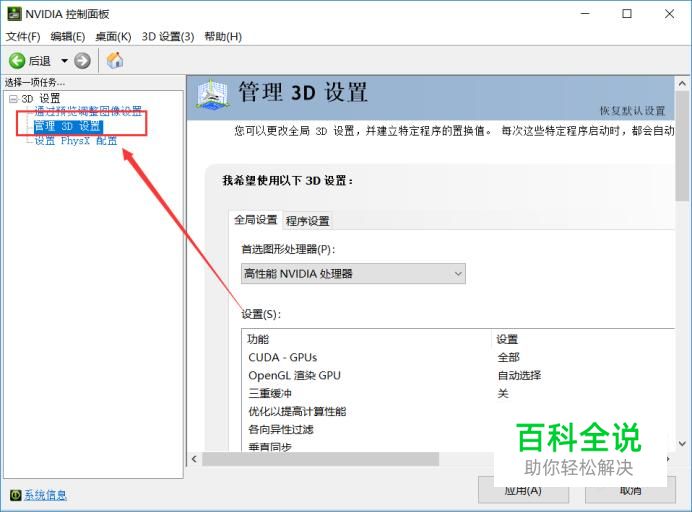 接下来,在打开的3D设置页面中,设置首选图形处理器为“高性能NVIDIA处理器”按钮,并点击“应用”按钮。选择管理3D设置,就会看到全局使用集显或者独显的选项,选择独立显卡之后,系统执行任务的时候就会使用你选择的显卡: