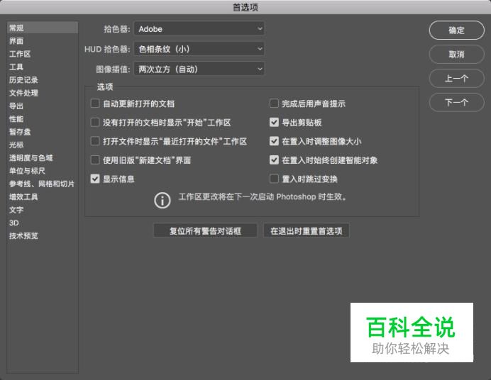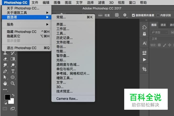 打开电脑中的PS软件,在上方属性栏中选择“Photoshop-首选项-常规”