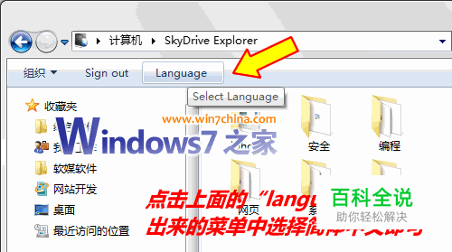 SkyDrive Explorer 支持几十种语言包括简体中文,双击SkyDrive Explorer 登陆后,你可以在资源管理器上方工具栏中找到“LANGUAGE”选项,点击后出来的菜单中选择简体中文就可以了。
