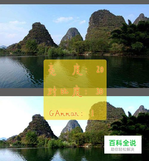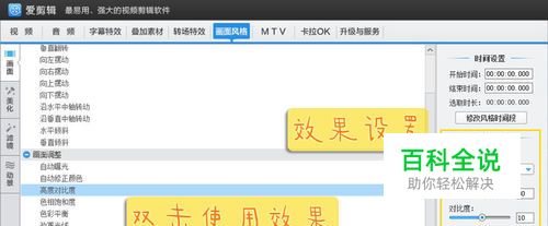 将软件界面切换到“画面风格”,选择“画面—亮度对比度”,然后在界面中央“效果设置”处调节效果。如果画面光线不够,那就移动“滑杆”给画面增点亮度;如果光线太足,那就给画面降低点亮度~如果觉得景色不够突出,就调节一下“对比度”咯~