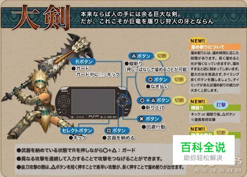 操作方式: △:纵斩 长按△:蓄力斩(最大3段,途中蓄力结束将会进入不同的阶段 3段蓄力有固定的时间 超过时间威力大为减少) ○:横扫 ○+△:捞斩 ×=前转回避 拔刀时R:防御