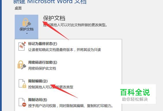 接着直接点击保护文档,然后点击下拉三角型,接着点击限制编辑,然后会弹出一个右侧栏来。