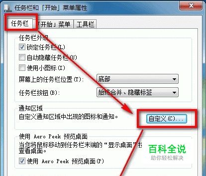 2,点击“属性”后会弹出“任务栏和[开始]菜单属性”,点击“任务栏”--“自定义”--“确定”,如图2: