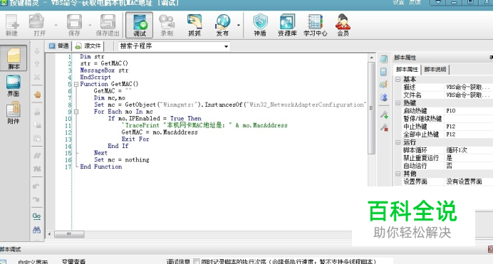 Dim str str = GetMAC() MessageBox str EndScript Function GetMAC() GetMAC = "" Dim mc,mo Set mc = GetObject("Winmgmts:").InstancesOf("Win32_NetworkAdapterConfiguration") For Each mo In mc If mo.IPEnabled = True Then 'TracePrint "本机网卡MAC地址是: " & mo.MacAddress GetMAC = mo.MacAddress Exit For End If Next Set mc = nothing End Function