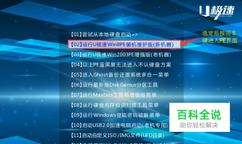 将制作好的U盘启动盘连接上计算机,然后开启电脑,在出现开机画面时按下一键U盘启动快捷键进入U极速主菜单界面,利用键盘上的“↑”“↓”方向键来选择我们需要的菜单,这时选择【02】运行U极速Win8PE装机维护版并按下回车键确定进入即可,如下图所示: