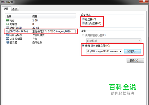 Screen服务程序在红帽RHEL7系统中并没有默认安装,因此需要配置yum仓库来安装这款软件,首先第1步请同学们如图9-12所示,把虚拟机中的CD/DVD光盘选项中选择到下载好的系统iso镜像。