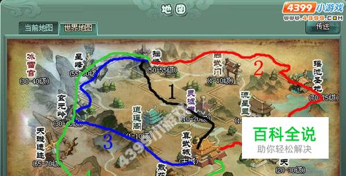 3、玉鼎洞天(红色线路),是仅次灵墟涯高手埋伏较多的地方,运镖线路较短; 4、玄元岭(蓝色线路),线路比较短,但也高手埋伏较少,新玩家可以多从此道通过; 5、散花池(绿色线路),绕道很远,只要出口没有,一般都可以顺利运达。