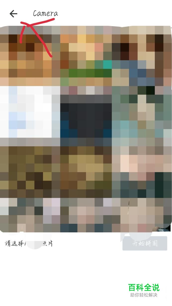 点击左上角的箭头按钮,如图1箭头所示。再选择你需要拼图的图片所在的相册,选择你想要的图片,再点击确认添加,如图1箭头所示