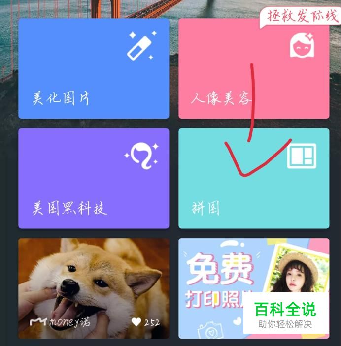 首先打开手机上的美图秀秀这个软件,如图1所示。点击拼图按钮,如图2箭头所示。