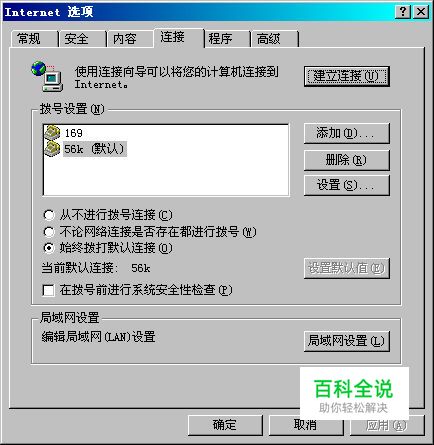 在图1中点击上面的“连接”标签,出现图2: 在图2中的“拨号设置”中确保你现在使用的连接是你要使用代理服务器的连接,一般情况下你不需要动,然后点击右边的“设置”按钮,出现图3:
