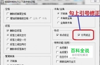 3.设置选项 启动排版助手后,点“选项”按钮。以下为设置要点: 1)标点:勾上“引号修正”。这是本次修正整理的关键。 2)空格:去除“删除段首尾空格”和“增加段首缩进空格”。原素材基础不错,不用这个选项了。如果原素材不好,要勾上这两个空格选项。 3)段落:保留默认,勾上“删除空段落”。其下选“段落之间无空行”。 注意:慎勾“删除非段落换行”。由于排版助手程序的bug或者不够智能,无法判断标题行与非段落换行之别,容易对标题行动手术。所以老牛一般不用这个功能。非段落换行问题改用word来处理。 4)半角/全角:选“不转换”。 5)特殊功能:暂时全不选。 设置完上述选项后,点“确定”,返回程序主界面。