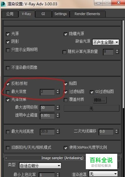 查看反射折射的最大深度,如果是浅色灰色噪点,将这个值加大,或去掉勾保持默认。如果是噪点为白色或其他彩色聚在某个对象的局部或是明显是彩色噪点分布在某个对象上,将这个值改小---------那很可能是场景中有多个反射折射对象,相互多次反射造成的。