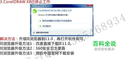 3.Corel DRAW X8已停止工作 解决方法: 升级IE浏览器到11.0,再打开软件即可。 IE浏览器升级方法1: 搜狗搜索下载IE11.0。 IE浏览器升级方法2: 360安全卫士更新 IE浏览器升级方法3: 微软中国官网下载安装 如升级了IE还打不开CDR,下步“控制面板”更新系统组件,更完打开软件。
