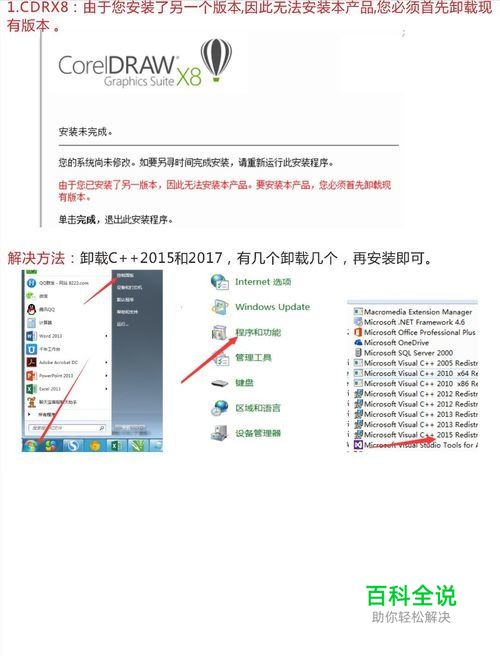 1.CDRX8: 由于您安装了另一个版本,因此无法安装本产品,您必须首先卸载现 有版本。 CorelDRAW X8 Graphics Suite. 安装未完成。 您的系统尚未修改。如要另寻时间完成安装,请重新运行此安装程序。 由于您已安装了另一版本,因此无法安装本产品。要安装本产品,您必须首先卸载现 有版本。 单击完成,退出此安装程序。 解决方法: 卸载C+ +2015和2017,有几个卸载几个,再安装即可。 其他的版本 X7 X6 X4 基本是一样