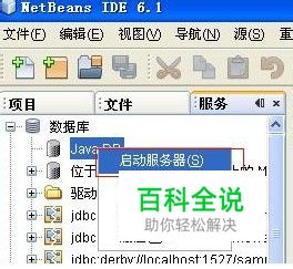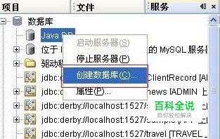 通过向导建立和使用数据库 第一步:选择服务视图,然后展开DataBase(数据库节点),右键点击JavaDB 启动服务器