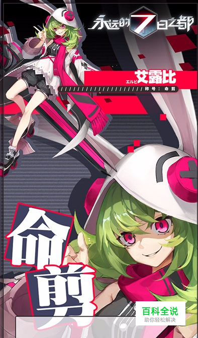 身穿可爱的兔子装,手里拿着一把超大的黑底红芯的大剪刀——命剪,剪刀就是她的武器,或许萌萌的外表才是她真正的武器。