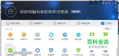 打开(没有的下载)腾讯电脑管家,并点击页面上的工具箱,点击网络修复。
