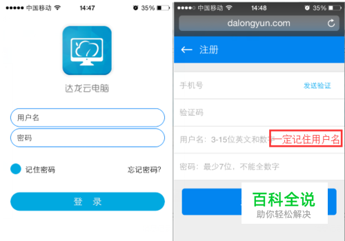 下载达龙云电脑,点击“注册”按钮进行手机号码绑定,账号密码注册。 用户名用于账号的登录。