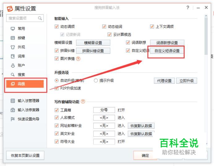 选择“高级”,进入高级选项页面,点击“自定义短语设置”,如图所示。