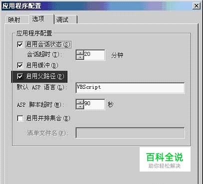 主目录与启用父路径。单击“主目录”标签,切换到主目录设置页面,(如图5)该页面可实现对主目录的更改或设置。注意检查启用父路径选项是否勾选,如未勾选将对以后的程序运行有部分影响。(如图6),主目录—配置---选项。此主题相关图片如下: 图5—默认Web站点主目录设置 此主题相关图片如下: 图6—默认Web站点启用父路径设置
