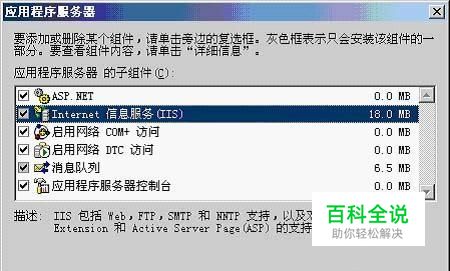 IIS的安装与配置。 安装IIS。 若操作系统中还未安装IIS服务器,可打开“控制面板”,然后单击启动“添加/删除程序”,在弹出的对话框中选择“添加/删除Windows组件”,在Windows组件向导对话框中选中“Internet信息服务(IIS)”,然后单击“下一步”,按向导指示,完成对IIS的安装。(图例如下图1、图2由于白茶123使用的是WindowsServer2003操作系统所以和大家的安装界面有所出入,但大体相同) 此主题相关图片如下: 图1—windows组件向导1 此主题相关图片如下: 图2—windows组件向导2