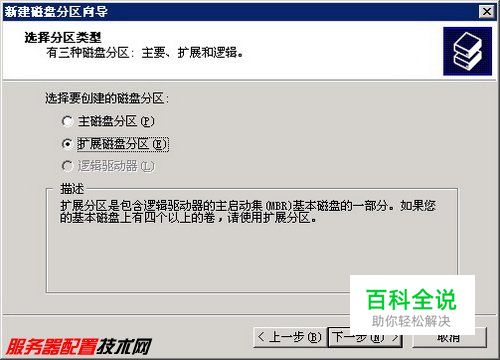 第4步,在打开的欢迎向导页中单击“下一步”按钮,打开“新建磁盘分区向导”。在“选择分区类型”向导页中选中“扩展磁盘分区”单选框,并单击“下一步”按钮,如图2009010915所示。 图2009010915 选择磁盘分区类型