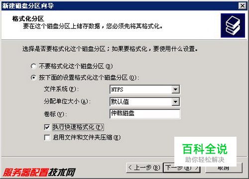 第10步,打开“格式化分区”向导页,默认情况下选择使用NTFS格式化分区。建议在“卷标”编辑框中输入该逻辑驱动器的标识,这会在还原磁盘时大大减少故障排除时间(本例输入“仲裁磁盘”)。然后选中“选择快速格式化”复选框,并依次单击“下一步/完成”按钮,如图2009010920所示。 图2009010920 格式化逻辑驱动器