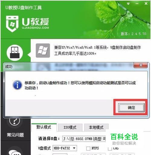 三、安装U教授软件。安装完成后打开U教授软件,插入U盘,点击“一键制作usb启动盘”按钮;