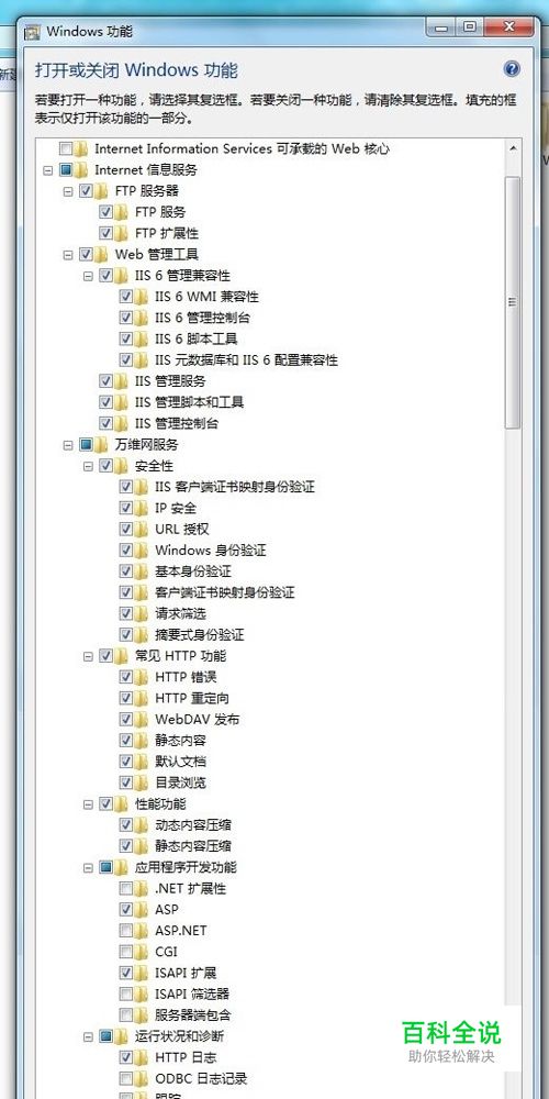 二、现在出现了安装Windows功能的选项菜单,注意选择的项目,我们需要手动选择需要的功能,下面这张图片把需要安装的服务都已经选择了,大家可以按照图片勾选功能。