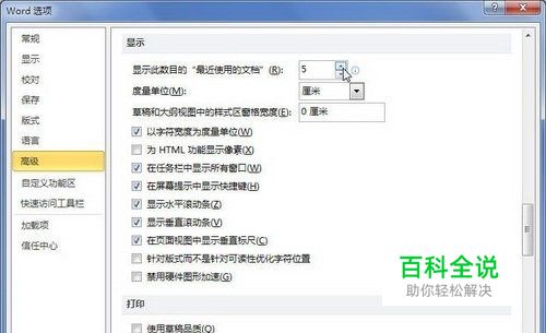 第2步,打开“Word选项”对话框,切换到“高级”选项卡。在“显示”区域设置“显示此数目的‘最近使用的文档’”数值,并单击“确定”按钮,如图2012020802所示。 图2012020802 设置“显示此数目的‘最近使用的文档’”数值