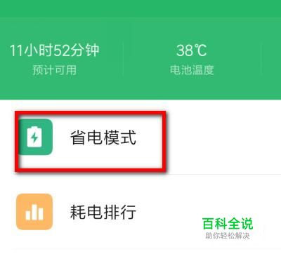 点击:省电模式;进入到设置页面,在这里,看“省电模式”右侧的开关,手指在开关右侧轻点一下,如下图所示的状态即开启成功。